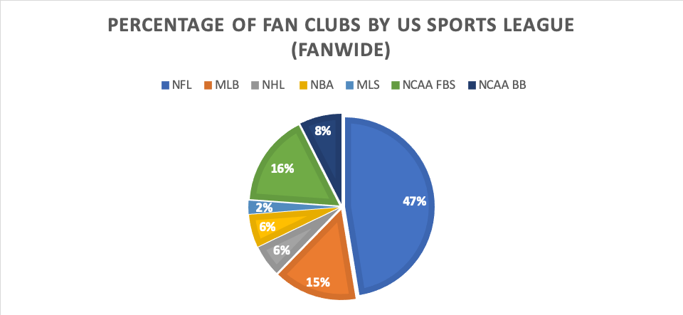 You will also find that some leagues are just more popular than other, which means that there are more fans spread around the country. The following chart shows the percentage of FanWide’s almost 12,500 fan clubs by each major American sports league. The NFL dominates with almost half of all the fan clubs (47%), followed by college football (16%), MLB (15%), college hoops (8%), and then the NBA (6%) and the NHL (6%).