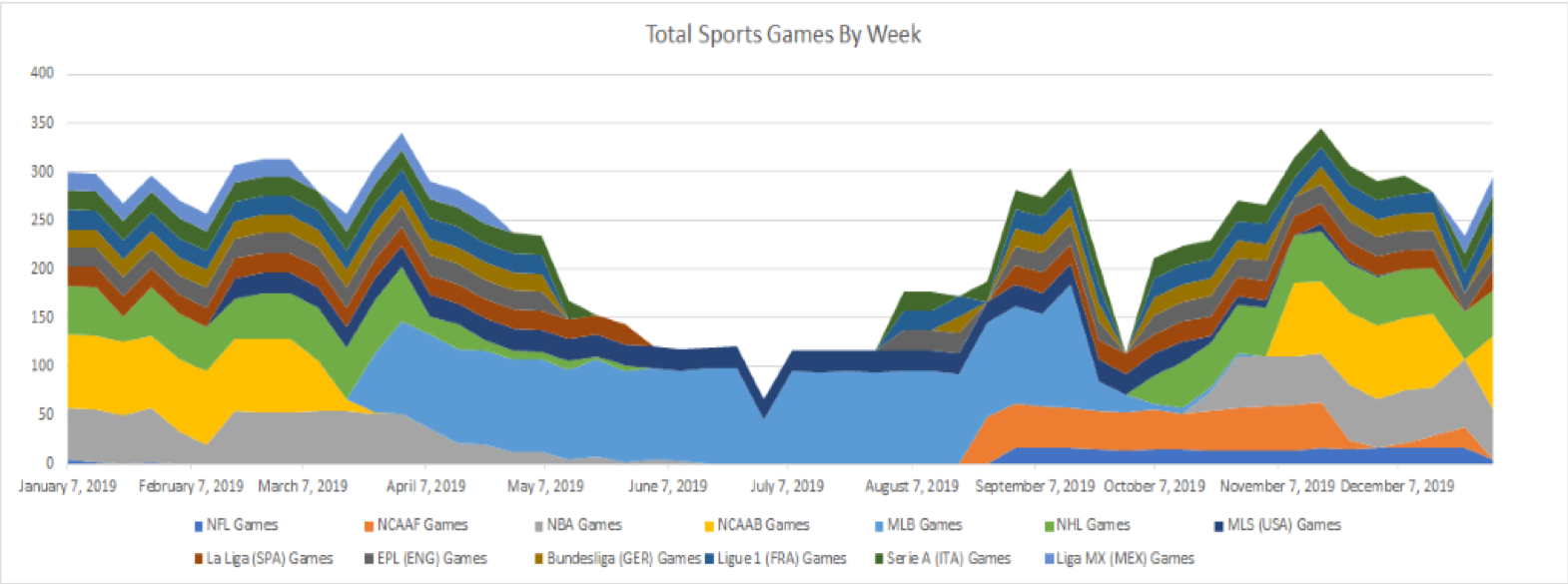 To give you the full picture of sports throughout the year, the following graph shows the total number of sports games in any given week throughout the year for all the popular televised sports.