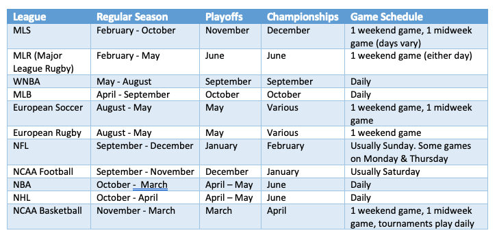 Next, you’ll then need to know which days the league plays their games throughout the week to make sure it still fits your schedule. You can use the following table to see the general operating months for the major sports leagues, sorted by their regular season start date.